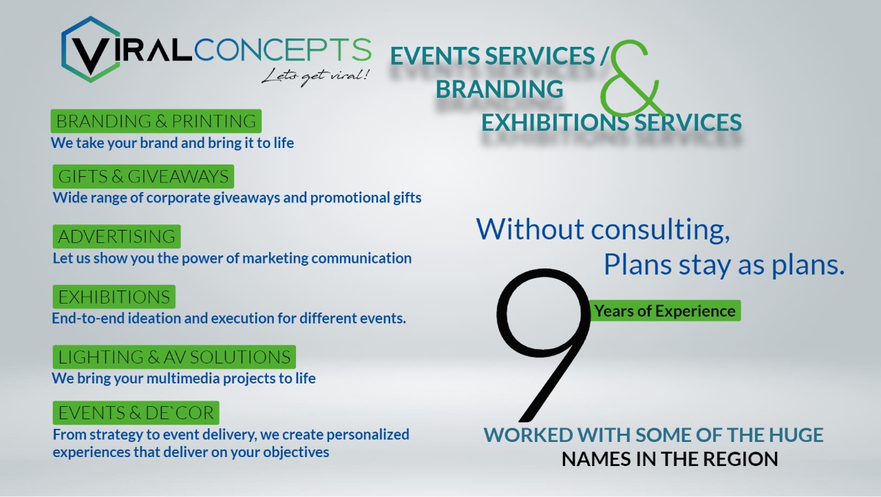 ‘VIRAL CONCEPTS’ - making a ‘distinguished mark’ within the Advertising, Events & Exhibition sphere, now we are not only your branding partner but with our new value added services we are your Event partner to provide all your needs at “one stop shop”.